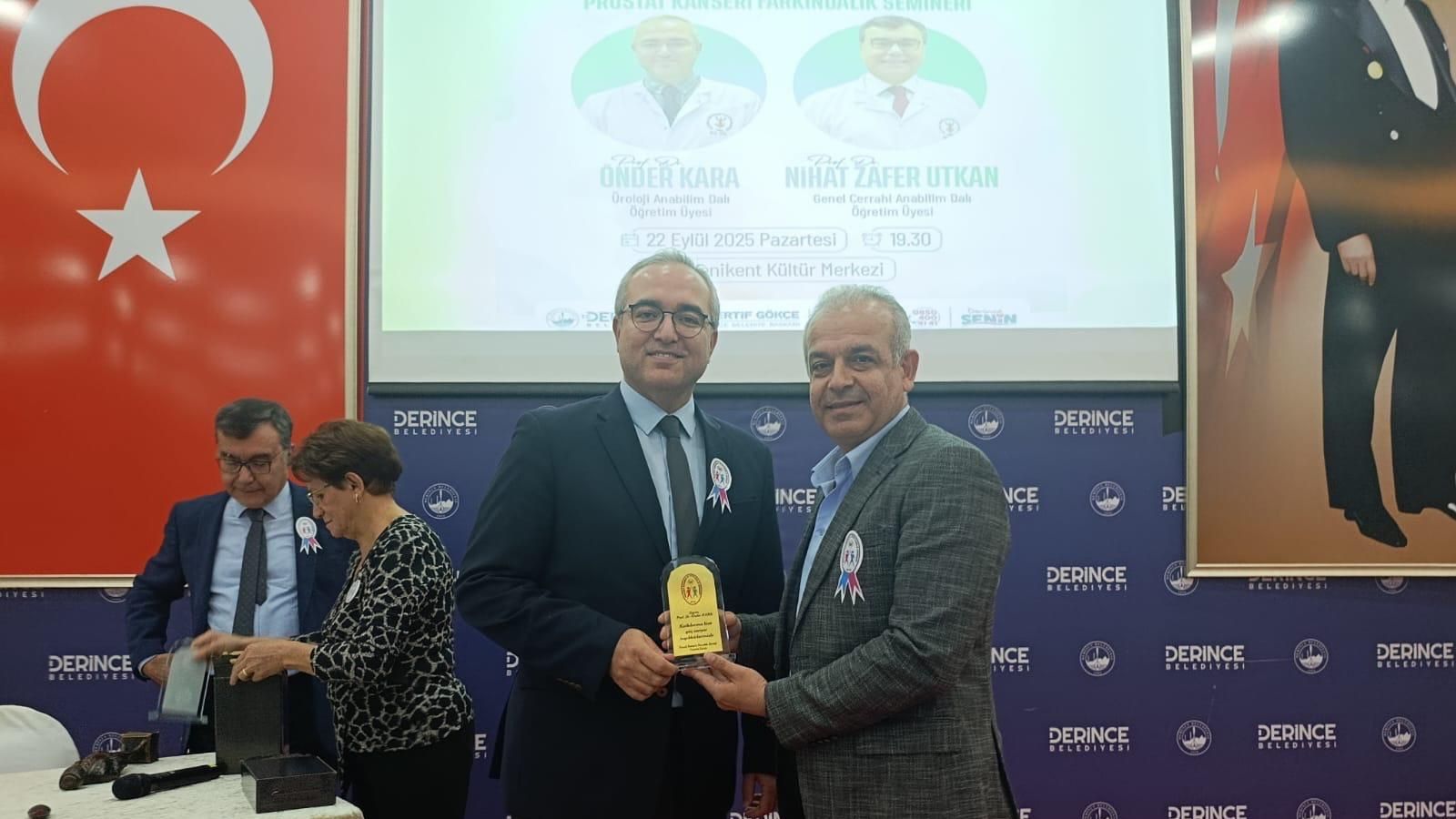 Derince Belediyesi toplum sağlığına yönelik bilgilendirici etkinlikler düzenlemeye devam ediyor. Bu kapsamda Kocaeli Üniversitesi ve Kocaeli Kanserle Mücadele Derneği’nin iş birliği ile Prostat Kanseri Semineri düzenlendi. Kocaeli Üniversitesi Tıp Fakültesi Üroloji Anabilim Dalı Öğretim üyesi Prof. Dr. Önder Kara ve Genel Cerrahi Anabilim Dalı Öğretim Üyesi Prof. Dr. Zafer Utkan’ın anlatımları ile gerçekleşen programda Derince Belediye Başkan Yardımcısı Mehmet Turan da hazır bulundu. Uzman akademisyenler gerçekleşen seminerde prostat kanserinde erken teşhisin önemi ve tedavi yöntemleri ile ilgili katılımcılarla önemli bilgiler paylaştı.