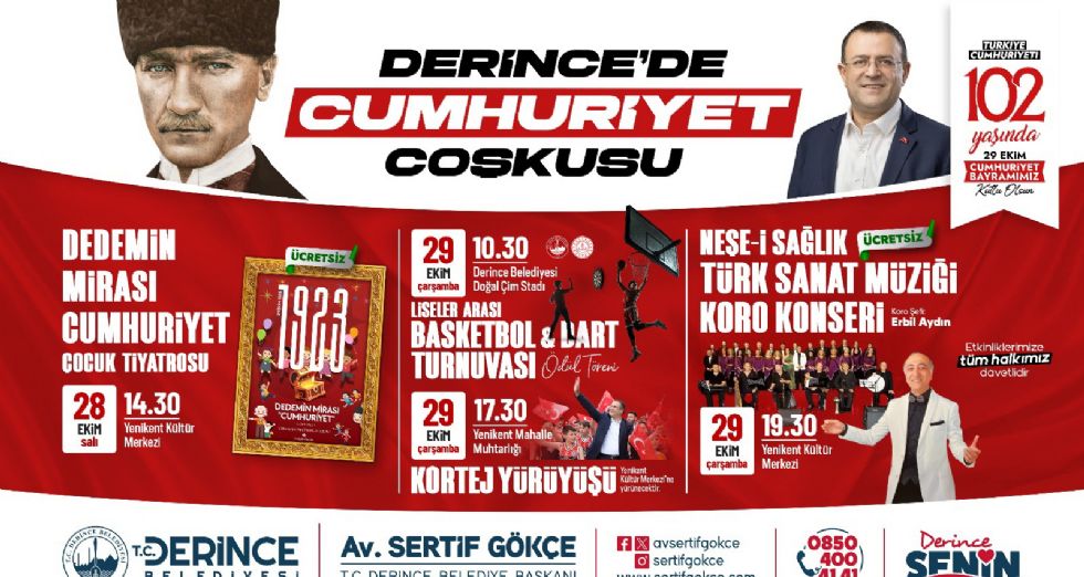 29 Ekim Cumhuriyet Bayramı’nın 102. yıl dönümü Derince Belediyesi’nin düzenleyeceği ve iki gün boyunca sürecek olan etkinliklerle coşku içerisinde kutlanacak. Cumhuriyet Bayramı kutlama programları kapsamında ilçede düzenlenecek olan etkinlikler ilk olarak 28 Ekim Salı günü tiyatro gösterisi ile başlayacak. Ücretsiz olarak gerçekleşecek Dedemin Mirası Cumhuriyet Çocuk Tiyatrosu, saat 14.30’da Yenikent Kültür Merkezi’nde gerçekleşecek.