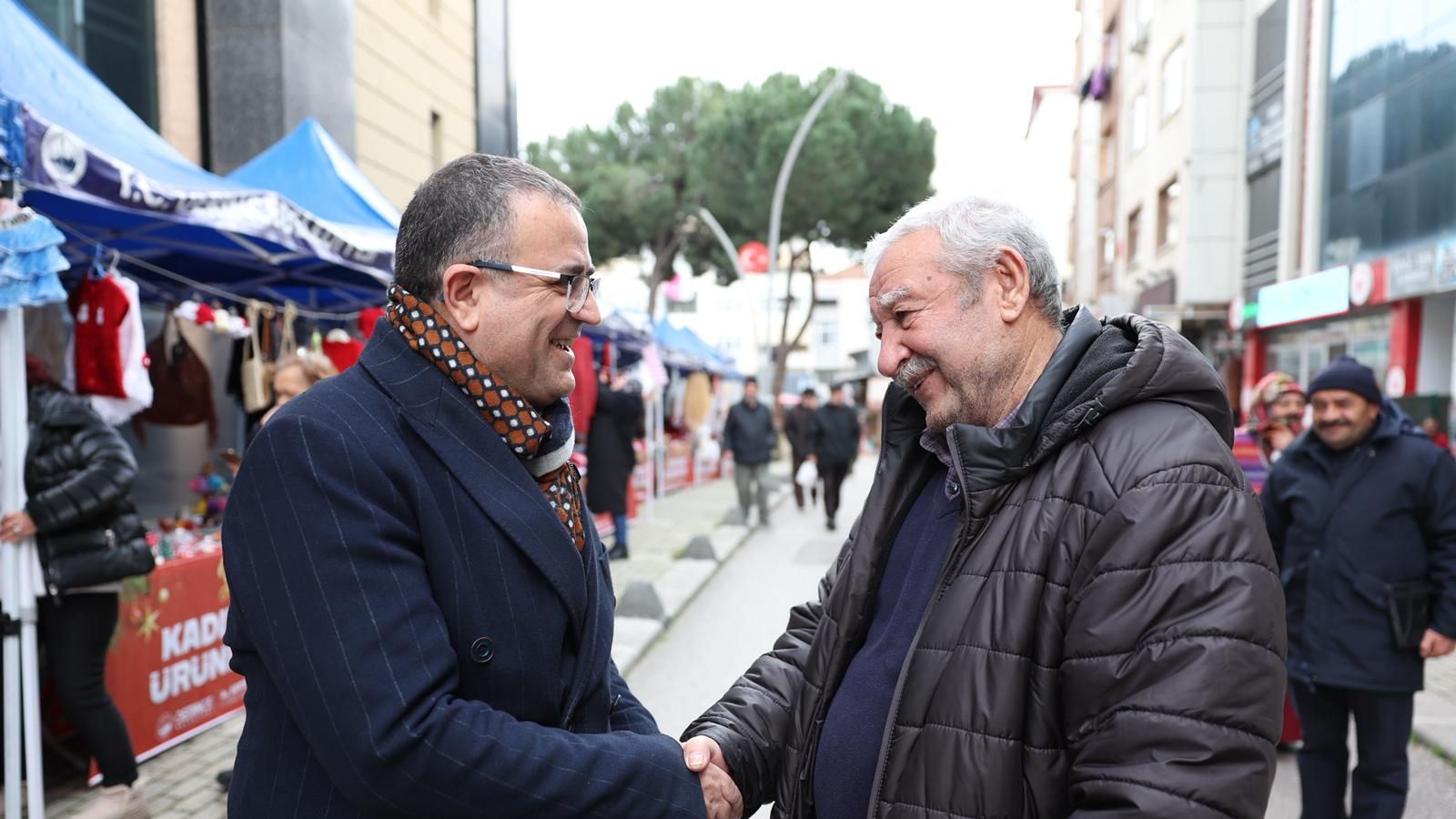 Derince Belediye Başkanı Av. Sertif Gökçe de başkan yardımcıları ile birlikte satış stantlarını ziyaret etti. Burada ürünlerini satan DER-MEK kursiyerlerine bol ve bereketli kazançlar temennisinde bulunan Başkan Gökçe, alışveriş yapan ilçe sakinleri ile de sohbet etti. Kadınların alın teriyle ürettiği birbirinden güzel ve özgün ürünlerin yer aldığı stantların aynı zamanda dayanışma, paylaşım ve kardeşlik ortamı sunduğunu belirten Başkan Gökçe, tüm ilçe sakinlerinin bu pazara davetli olduğunu belirtti. Derince Belediyesi’nin kurduğu satış stantları yeni yıl öncesi sevdiklerine hediye almak ve alışveriş yapmak isteyenler için çok güzel fırsatlar sunuyor.
