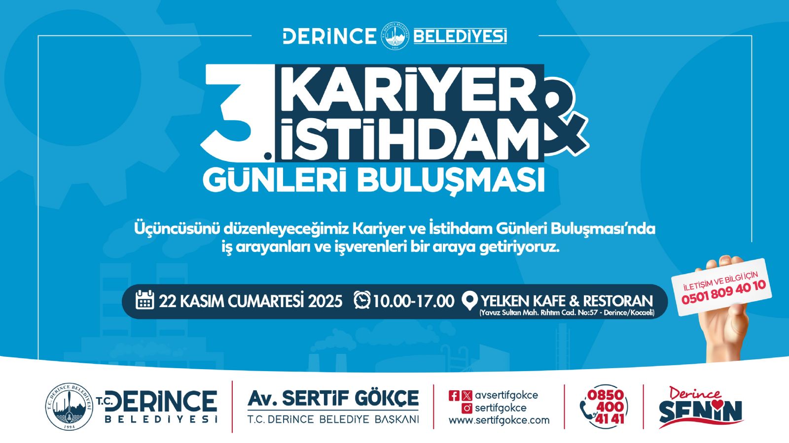 Derince Belediyesi’nin istihdama katkı sunmak, iş arayan vatandaşlar ve işverenleri bir araya getirmek için düzenlediği Kariyer ve İstihdam Günleri Buluşması’nın üçüncüsü için geri sayım başladı. Kurumsal firmalar ile iş arayan vatandaşları bir araya getiren platform Derince Belediyesi’nin ev sahipliğinde gerçekleşecek. İstihdama önemli oranda katkı sunan Kariyer ve İstihdam Günleri Buluşması, 22 Kasım Cumartesi günü Yelken Kafe Restaurant’ta gerçekleşecek.