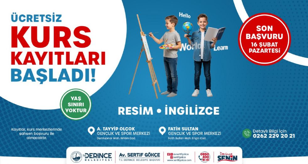 Derince’yi eğitimden kültüre, sanattan spora ve müziğe uzanan projelerle örnek bir kent haline getiren Derince Belediye Başkanı Av. Sertif Gökçe öncülüğünde, ilçede iki önemli kursun daha startı veriliyor. Derince Belediyesi’nin ücretsiz olarak düzenleyeceği resim ve İngilizce kursları için kayıt süreci başlarken, müracaatların 16 Şubat Pazartesi gününe kadar devam edeceği belirtildi.