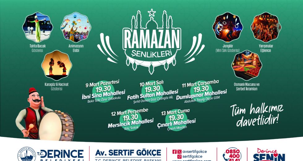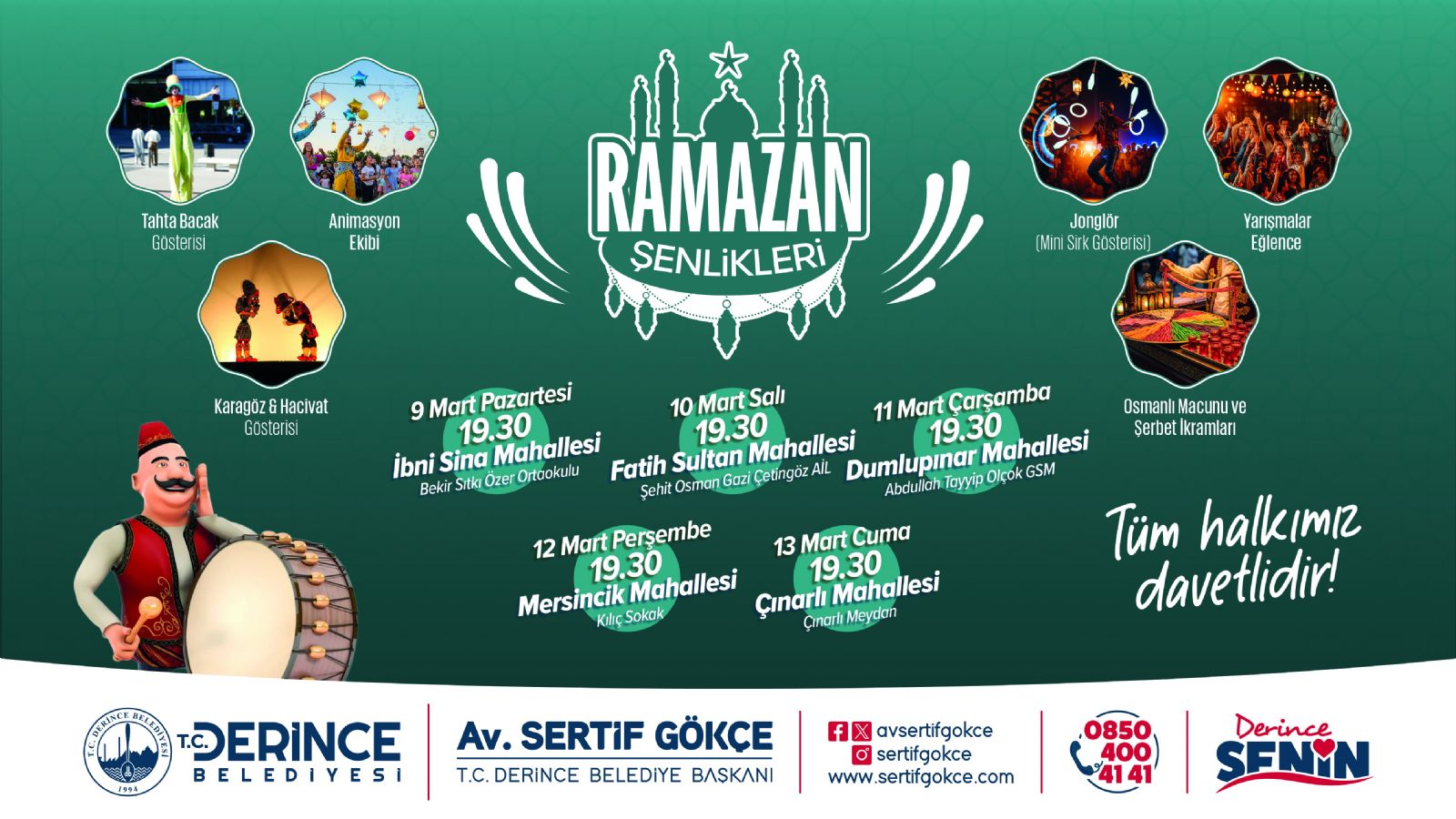Derince Belediyesi tarafından düzenlenen Ramazan Şenlikleri, 9-13 Mart tarihleri arasında ilçenin farklı mahallelerinde vatandaşlarla buluşacak. Birbirinden renkli gösteri ve etkinliklerin yer alacağı programlarda, Ramazan ayının birlik ve beraberlik ruhu mahallelere taşınacak. Her gün saat 19.30’da başlayacak etkinliklerde özellikle çocuklar için hazırlanan sahne gösterileri ve sürpriz aktivitelerle aileler keyifli bir Ramazan akşamı yaşayacak.