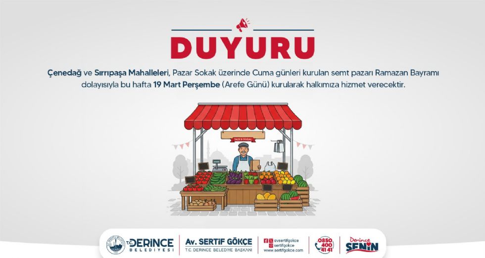 Derince Belediyesi’nden yapılan açıklamada bayram gününe denk gelen Derince Merkez Semt Pazarı’nın Arefe Günü kurulacağı belirtildi. Yapılan duyuruda “Çenedağ ve Sırrıpaşa Mahalleleri Pazar Sokak üzerinde Cuma günleri kurulan semt pazarı Ramazan Bayramı dolayısıyla bu hafta 19 Mart Perşembe (Arefe Günü) kurularak halkımıza hizmet verecektir.” denildi. Bu açıklama ile bayram öncesinde alışveriş yapmak isteyen ilçe sakinlerinin kurulacak olan pazardan ihtiyaçlarını temin edebilecekleri belirtildi.