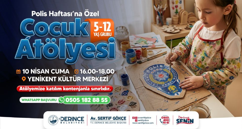Çocukların sosyal becerilerini geliştirmek ve el sanatlarıyla tanışmalarını sağlamak amacıyla yıl içerisinde çeşitli atölye çalışmaları organize eden Derince Belediyesi, Polis Haftası’na özel etkinlik düzenliyor. 5 – 12 yaş arası çocukların katılımıyla birlikte Polis Haftası’na özel düzenlenecek keyifli ve öğretici Çocuk Atölyesi’nde minikler hem eğlenecek hem de el becerilerini geliştirerek unutulmaz bir deneyim yaşayacak. 10 Nisan Cuma günü 16.00 – 18.00 saatleri arasında gerçekleşecek olan etkinlikler Yenikent Kültür Merkezi’nde düzenlenecek. Sınırlı kontenjanın bulunduğu ve başvuruların whatsapp üzerinde alındığı atölyelere katılmak isteyenlerin bilgi ve kayıt için 0 505 182 88 55 numaralı telefonla iletişime geçebilecekleri belirtildi.