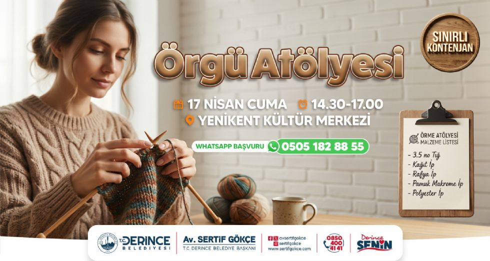 Örgü Atölyesi çalışmalarında kontenjanın sınırlı olduğu ve başvuruların whatsapp üzerinde alındığı belirtildi. Açıklamada atölye çalışmalarına katılmak isteyenlerin kayıt için 0 505 182 88 55 numaralı telefonla iletişime geçebilecekleri ayrıca kağıt ip, rafya ip, pamuk makrome ip veya polyester iplerden herhangi biriyle kursa katılım sağlanabileceği ifade edildi.